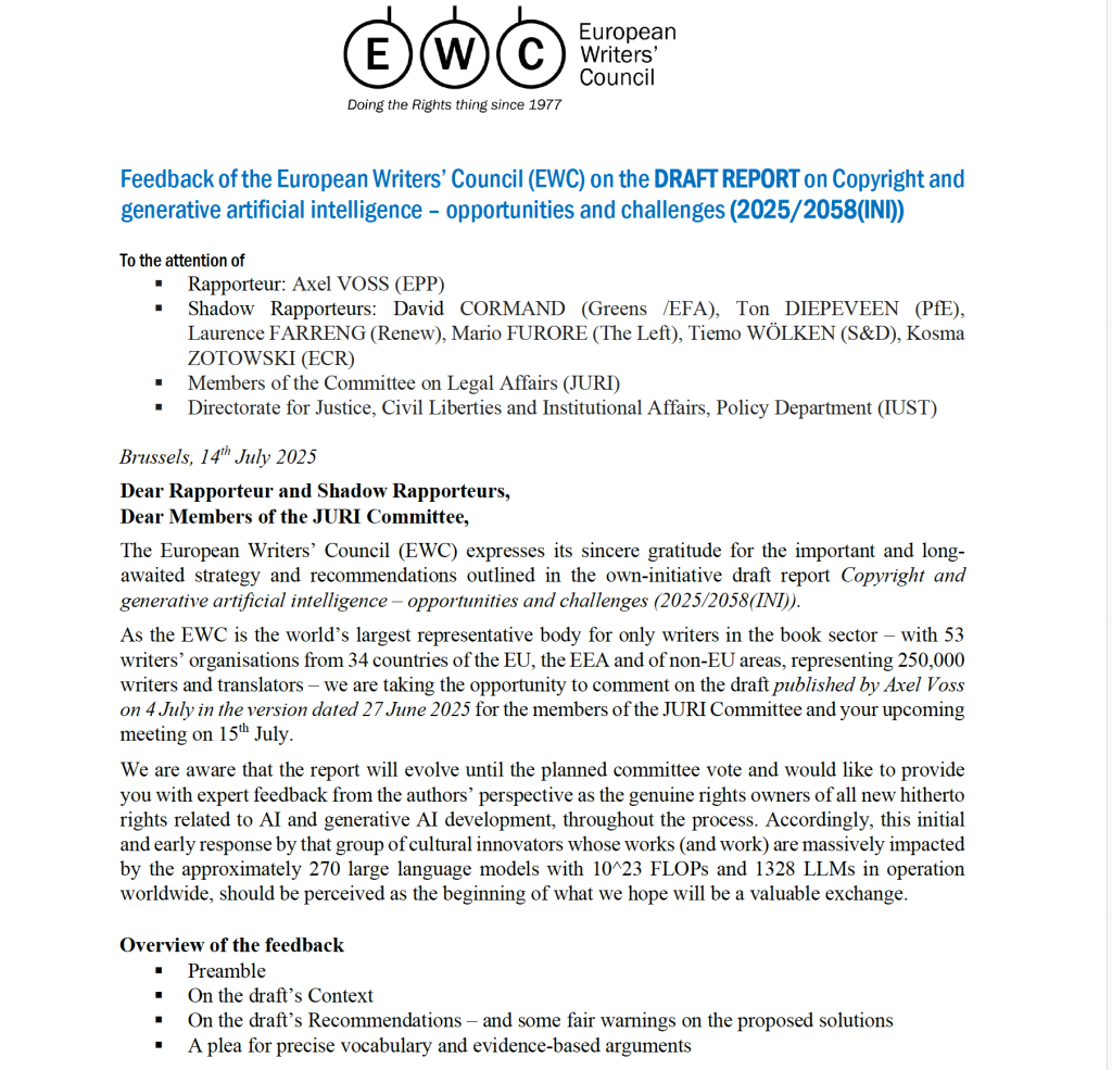 The European Writers’ Council (EWC) expresses its sincere gratitude for the important and long-awaited strategy and recommendations outlined in the own-initiative draft report Copyright and generative artificial intelligence – opportunities…